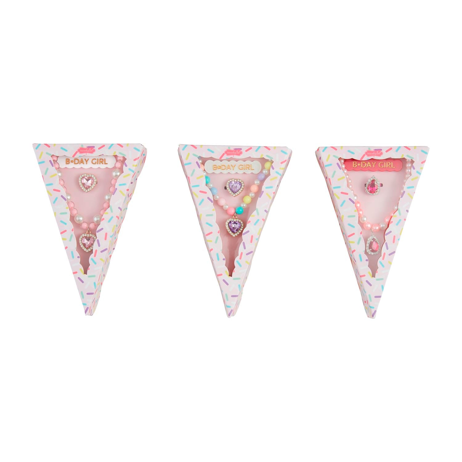 Play dress up with the birthday girl! Set includes necklace, ring and acrylic b-day girl hair clip in cake slice box.