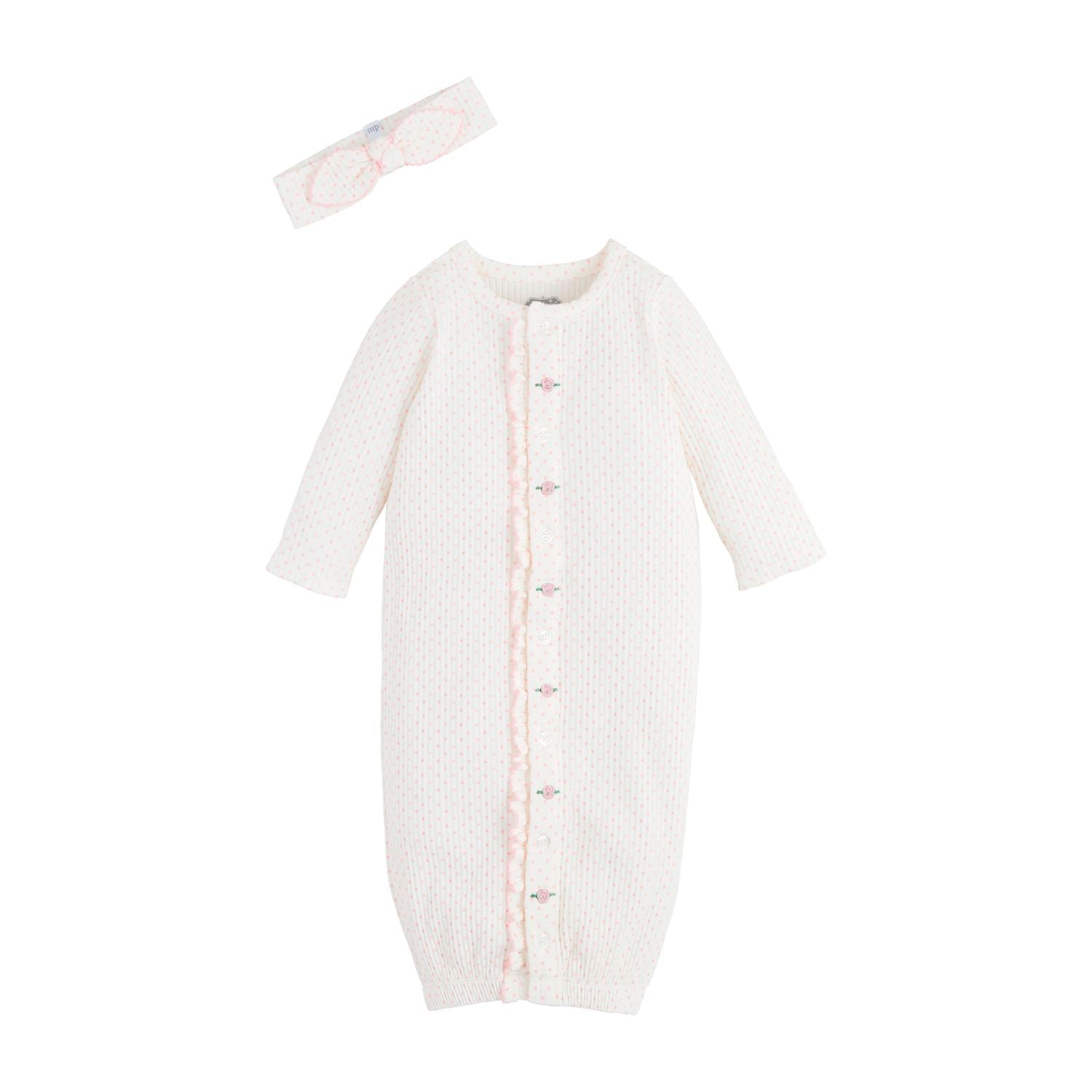 2-piece set. Cotton rib sleep gown features ruffle pearlized button placket with rosette embroidery. Comes with bow headband.